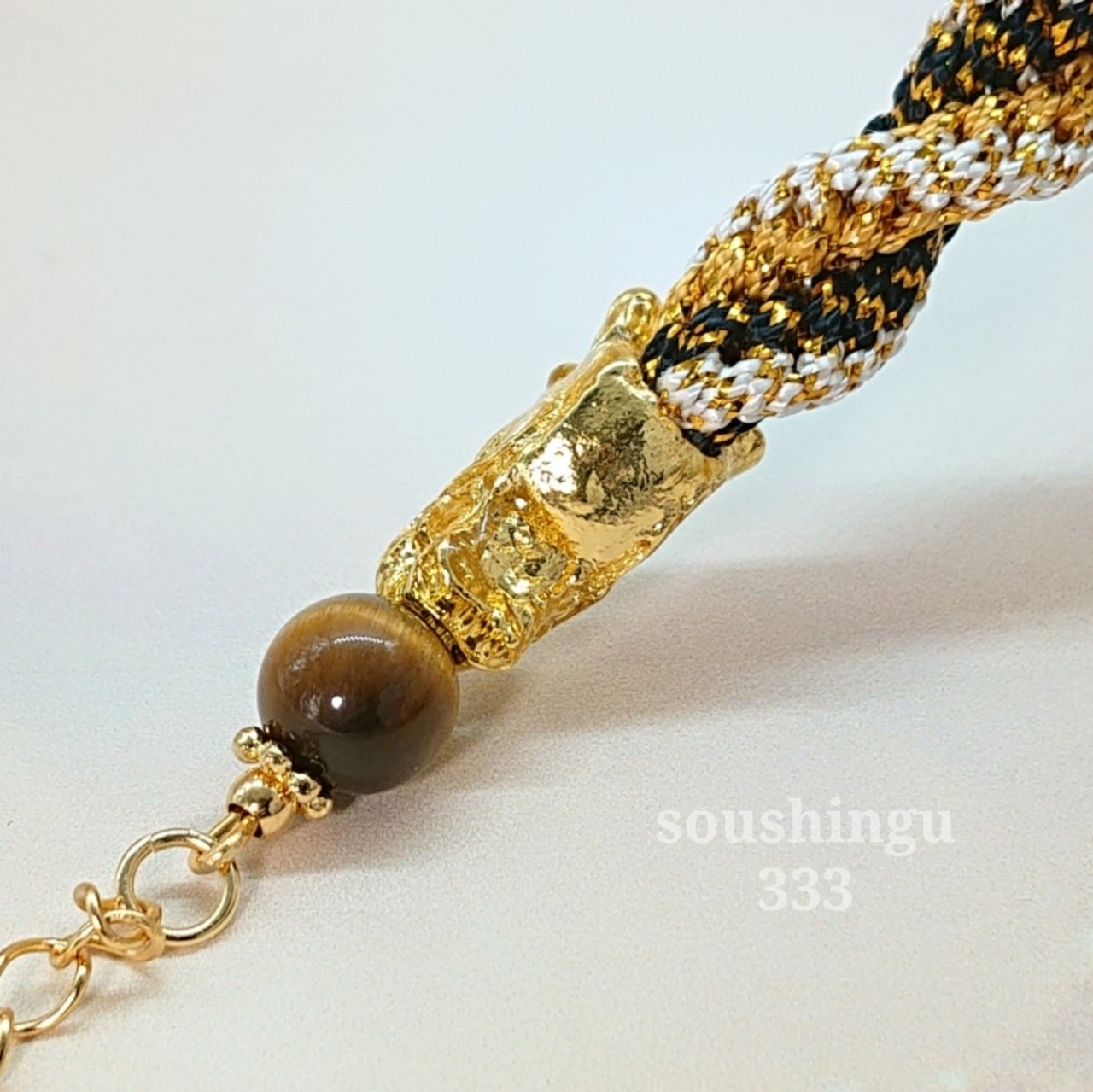 龍虎相討つことなく金龍と虎が融合した、龍虎ならぬ「金龍虎」。ブレスレット状にして再現してみました。日本の伝統工芸「組紐」の技術を用いて作成。組紐を胴体とし、龍の頭と組紐を組み合わせて全体が龍になるように仕上げました。虎のしま模様を意識して金と黒でデザインしており、少々派手なデザインとなっております。龍頭の部分ですが出来るだけ変色を防ぐために表面をレジンでコーティングしております。