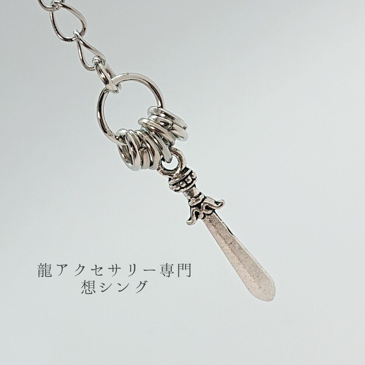 龍の顔ですが、額には仏像によく見られる「白毫」をイメージして銀色の粒をつけています。本来明王に白毫は付かないそうなのですが仏教の世界観を出してみたかったのであえて付けてみました。また、お不動さんがもつ倶利伽羅剣にちなんで剣のチャームを使用。この剣のチャームのところに「錫杖」もイメージして、丸い輪っかを数個付けています。